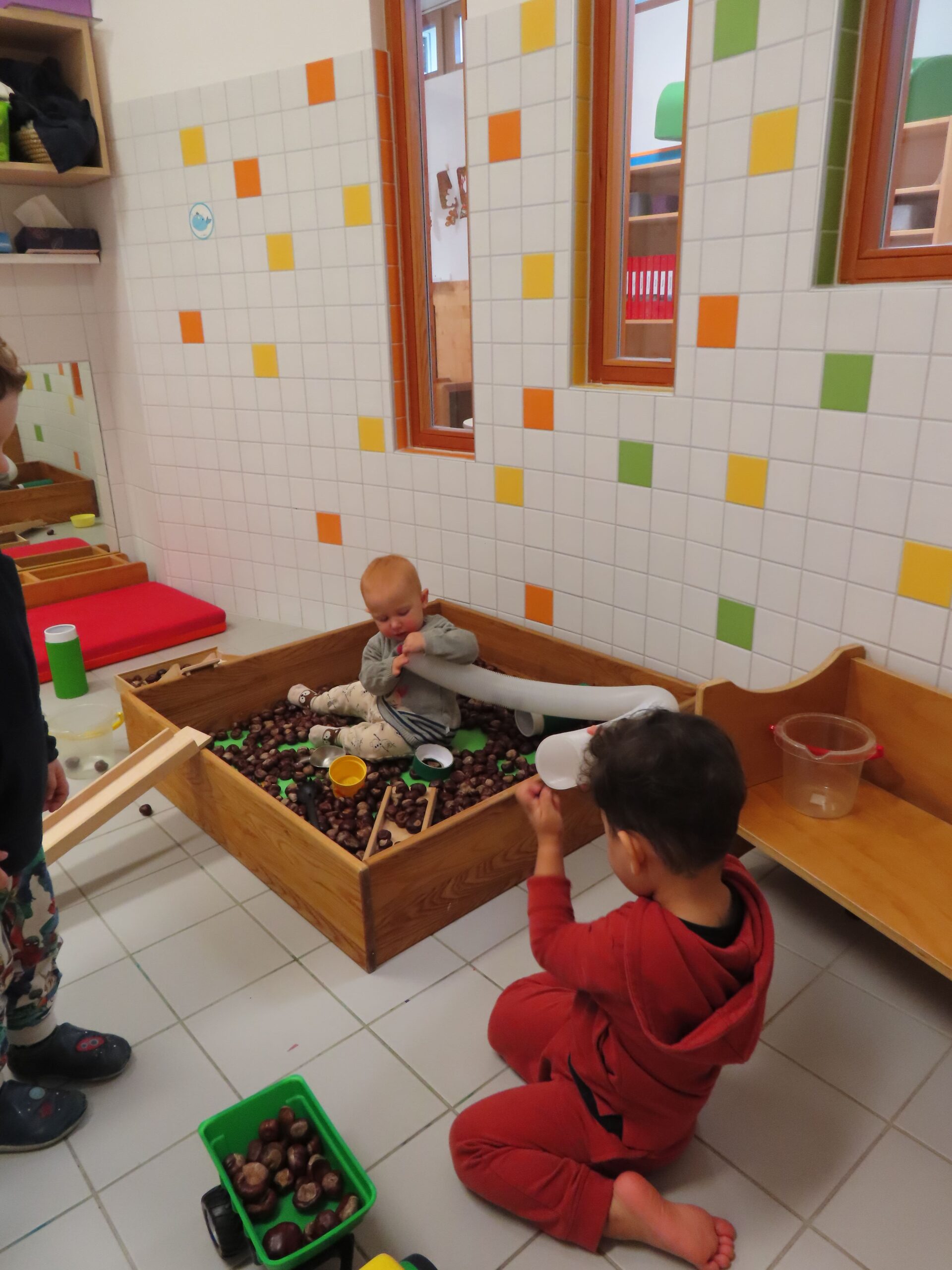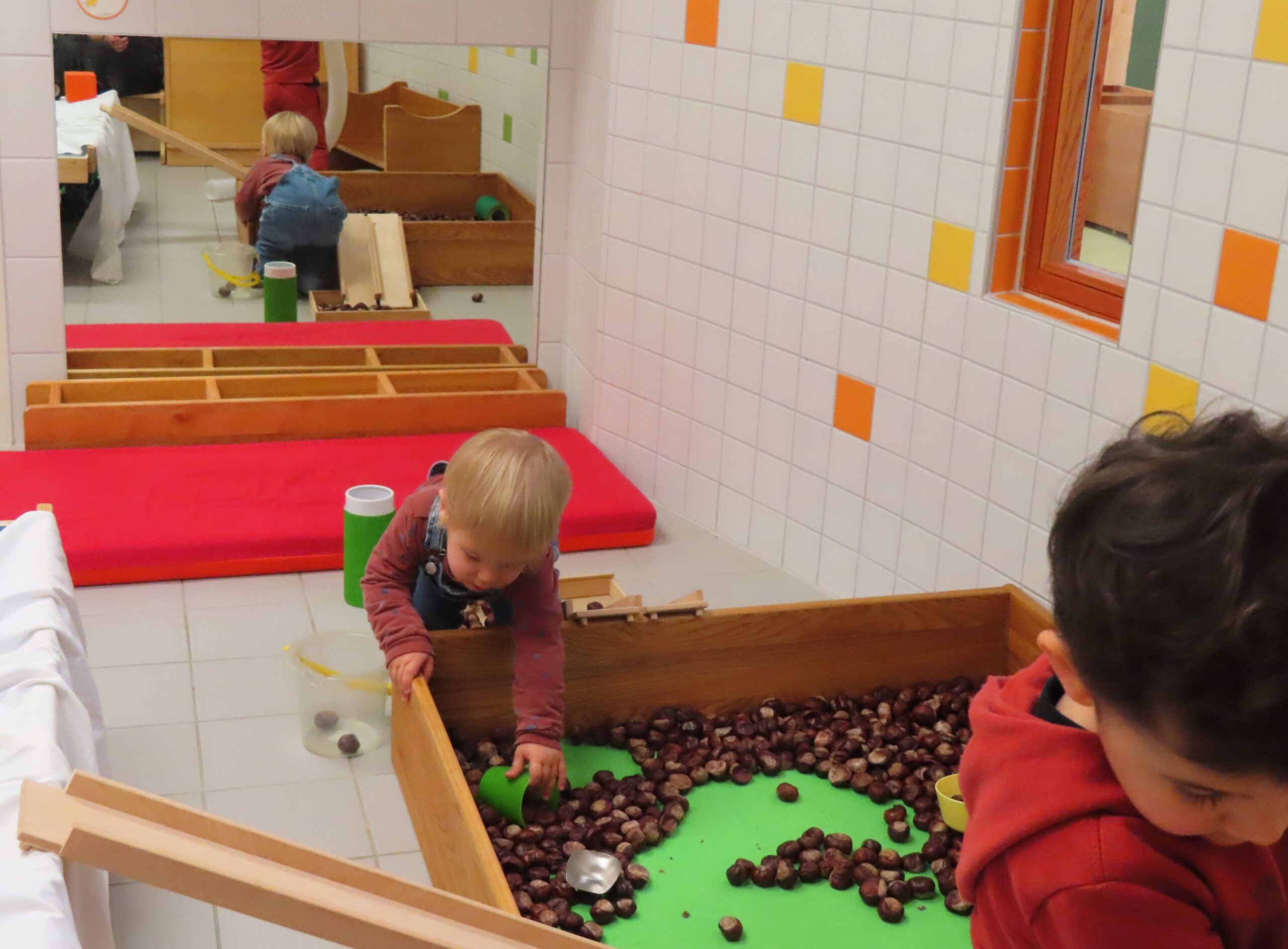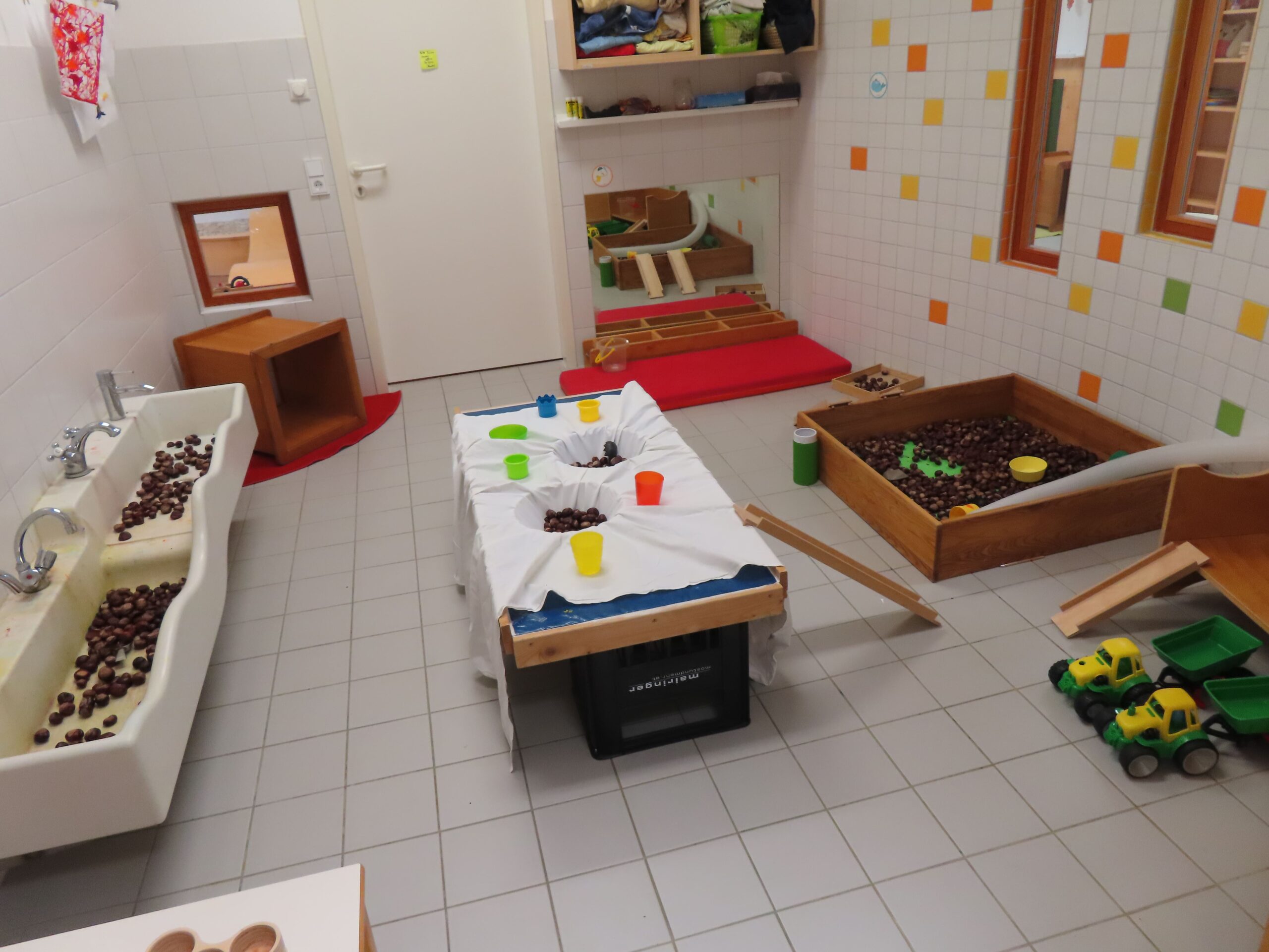 Das Atelier im UG wird im November zu einer einladenden Kastanienwelt umgestaltet. Sie gibt den Kindern Raum und Zeit,