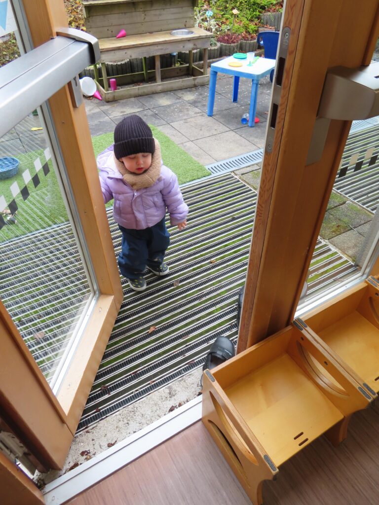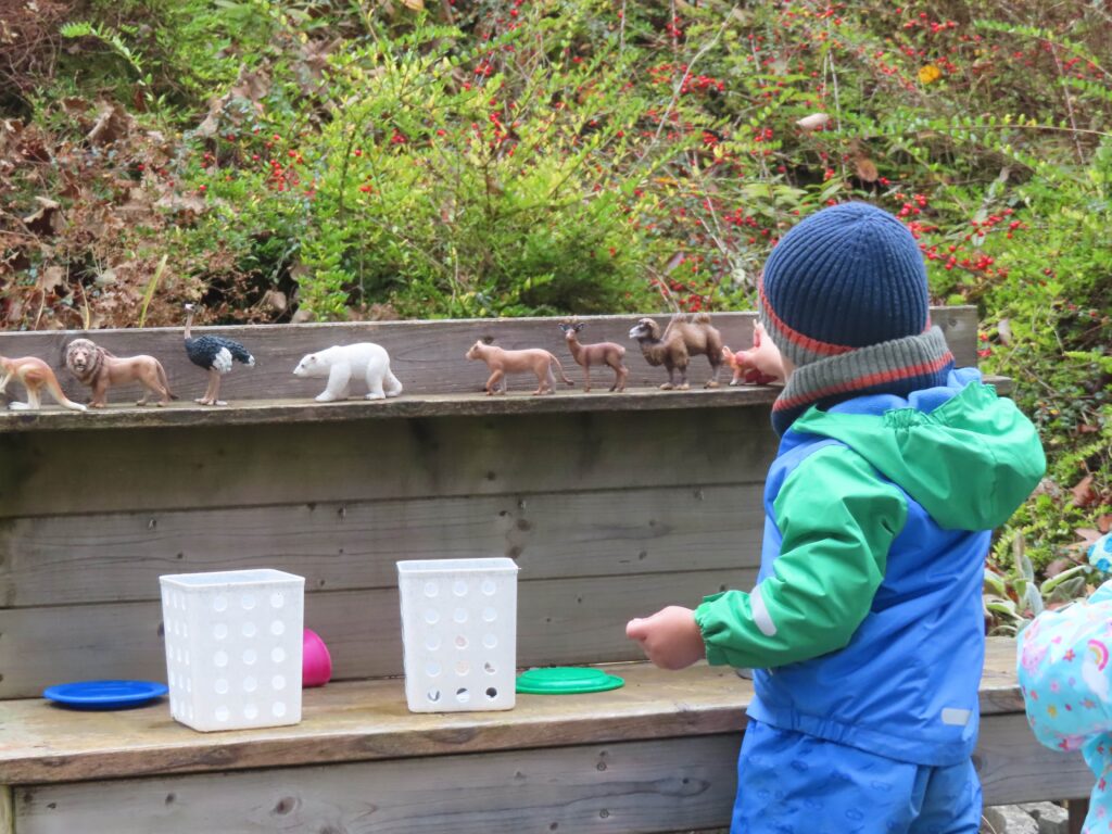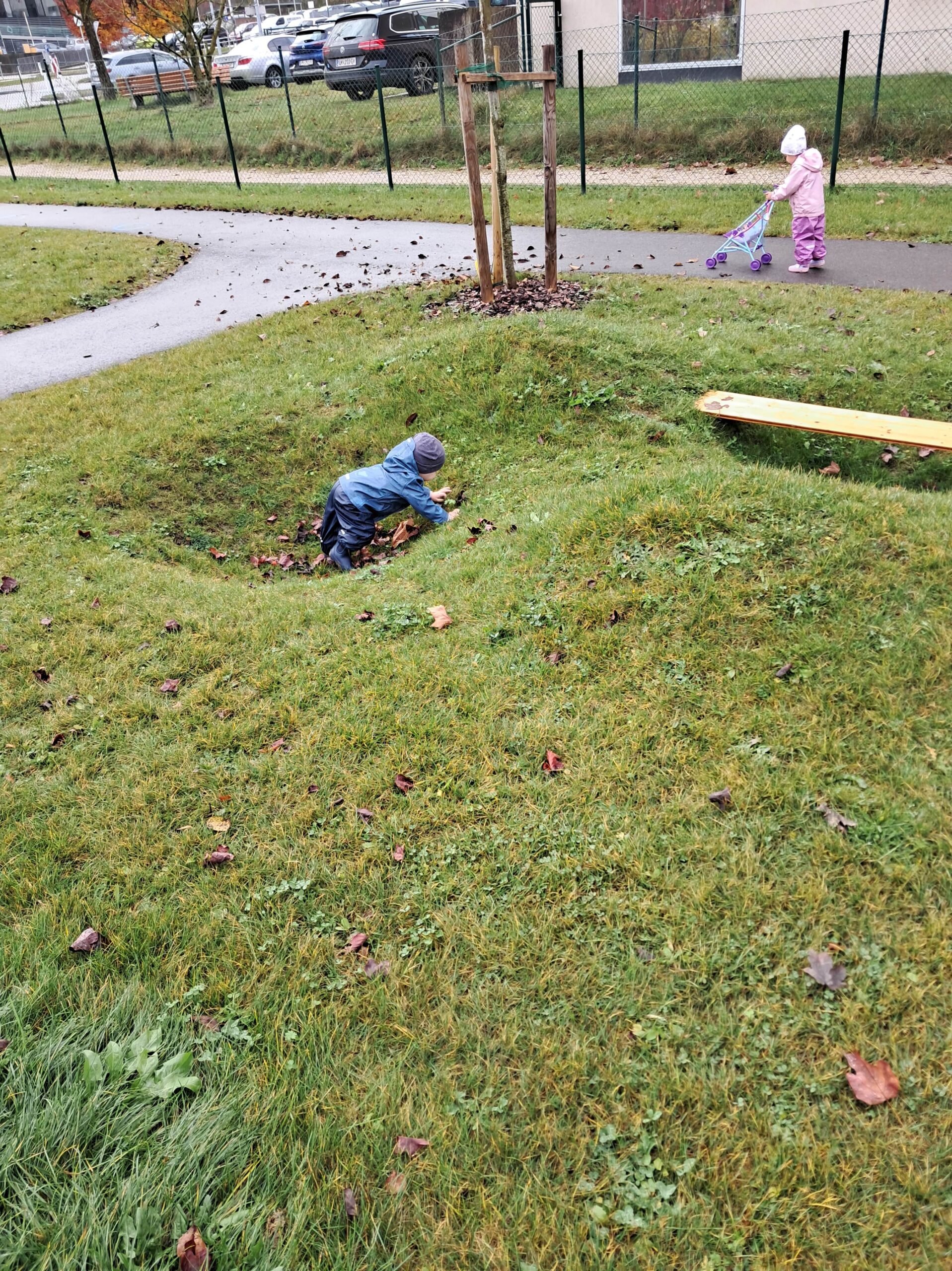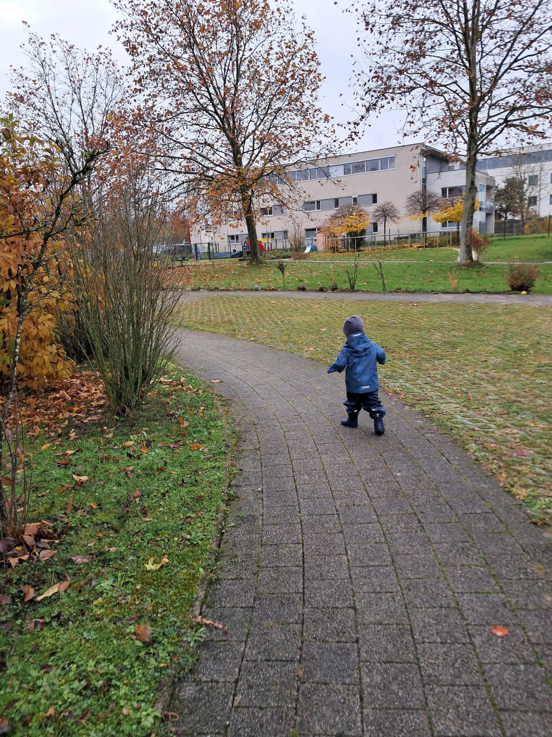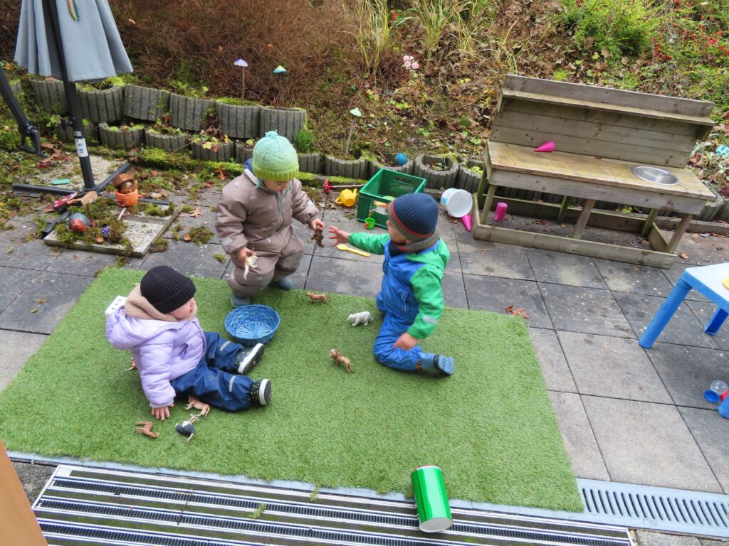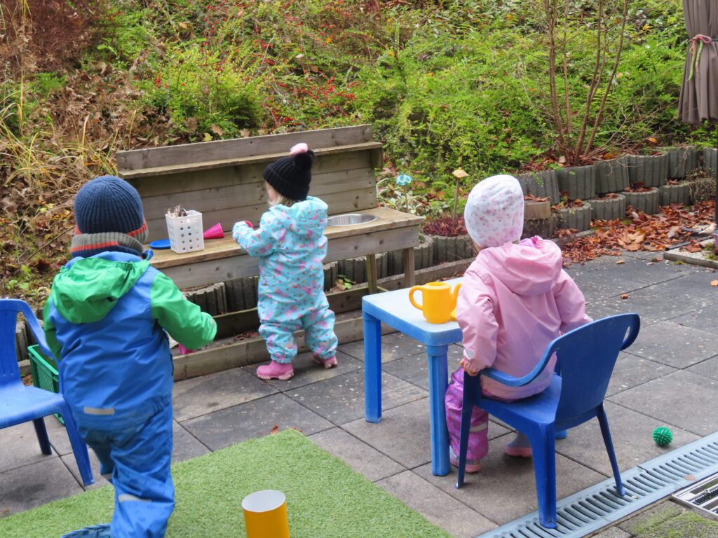 Gummistieferl und Matschgewand noch im Gruppenraum angezogen, Tür auf und los gehts mit dem freien Spiel unter blauem Himmel. Ein Traum!