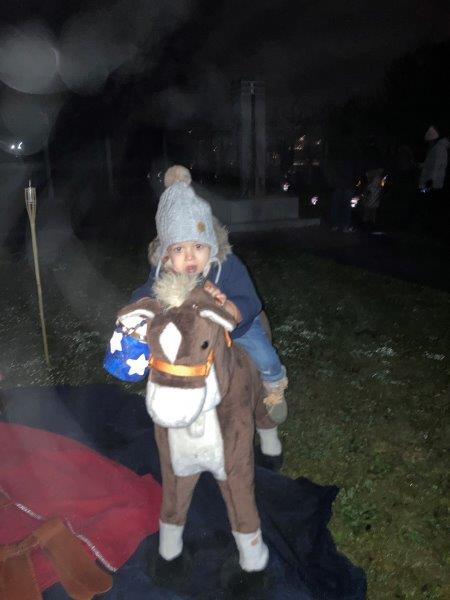 Zu den Klängen von „Ich geh mit meiner Laterne“ ging es zum Hl. Martin mit seinem Pferd und zum Schluss wurde noch das MARTINSKIPFEL geteilt.
